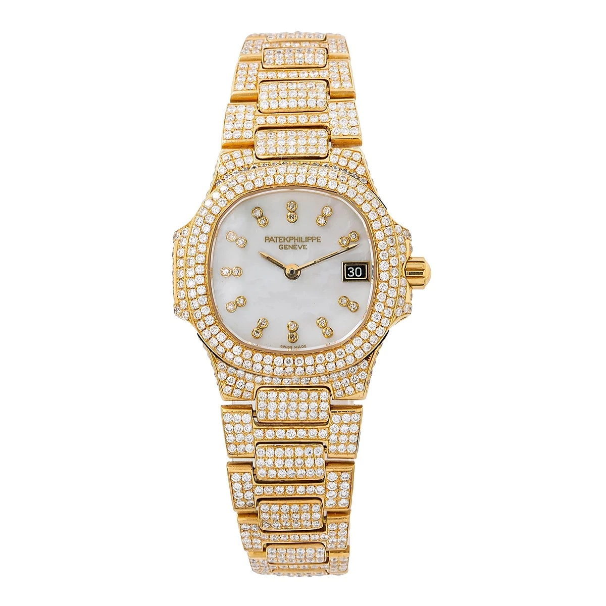 From our ladies diamond watches collection This Iced Out 18k Yellow Gold Patek Philippe diamond watch for women features 27mm case iced out with 11.75 carats of sparkling round diamonds, the watch features white mother of pearl dial diamond indices and is extremely glamorous with its dazzling bezel, sides and bracelet all encrusted with genuine white diamonds. The elegant square white dial of this precious watch is featuring two round diamonds set in place of each hour marker and a date window positioned at three o’clock. With even the clock hands being 18K gold, this distinctive timepiece can become an unforgettable present for a special occasion or a certain milestone in a relationship. This amazing watch is pre-owned, in like new condition and comes with a 2 year warranty.