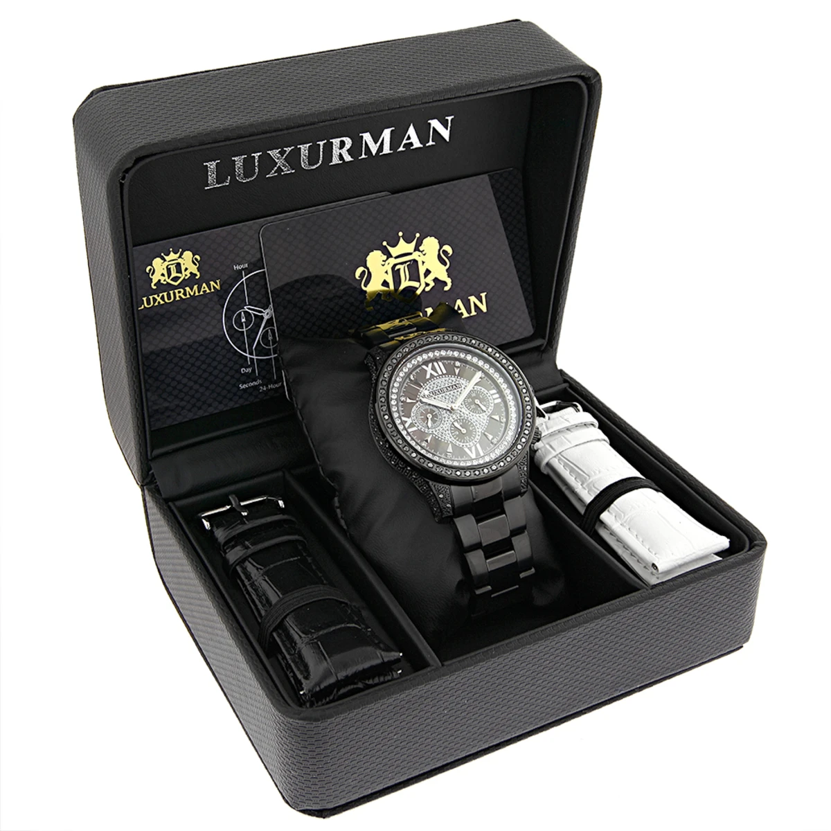 Black Diamond Watches Collection: Introducing a unique Luxurman Men’s Diamond Watch Liberty model; quality made this all black plated stainless steel diamond watch for men features amazing attention to detail, 2.25 carats of diamonds and comes with 2 extra leather bands in different colors with quick release pins. Makes a terrific gift for any occasion.