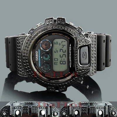 Fantastic Iced Out G SHOCK Watches: This Black Diamond Watch G-Shock is based on the original DW6900 Casio watch model. This men’s diamond G-Shock watch features 4.50 carats of sparkling black diamonds around the bezel, a black stainless steel case, a black rubber band and a digital dial code. This G-Shock custom diamond watch is water-resistant to 200m. A custom G-Shock Diamond Watch is a stylish addition to any wrist.