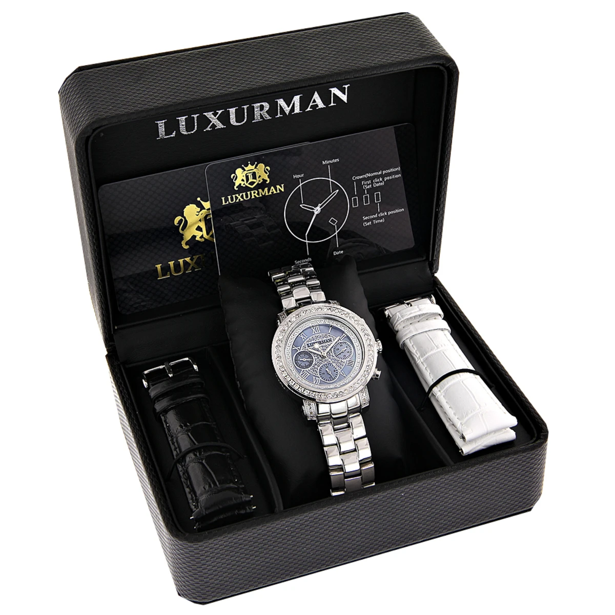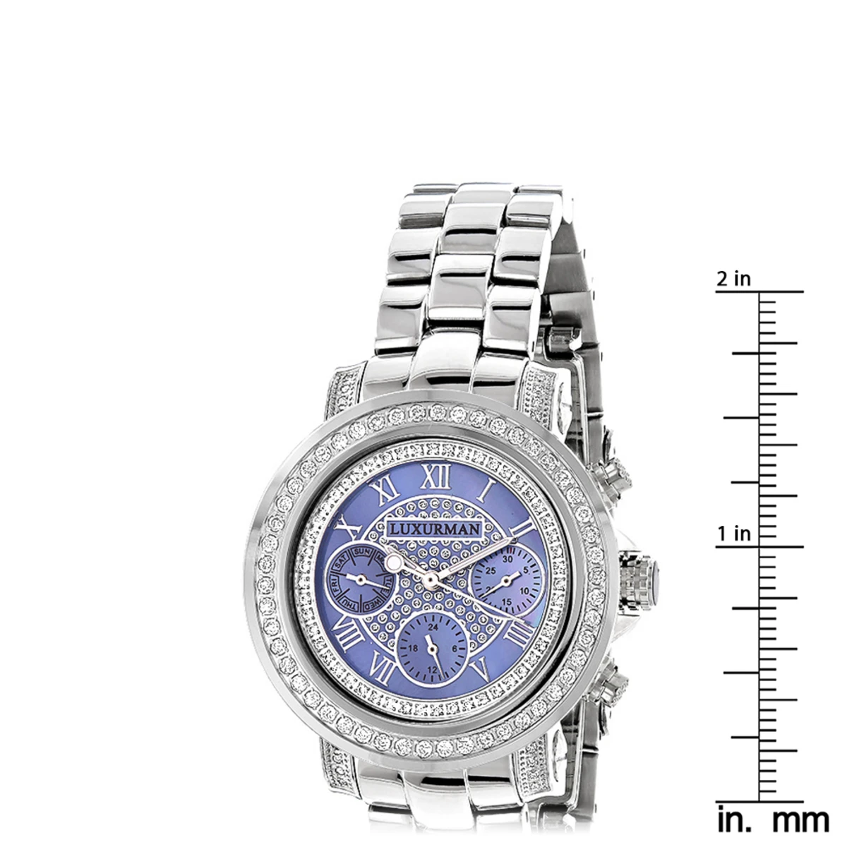 Ladies Diamond Watches: this Luxurman Montana Blue MOP Watch features 2 carats of genuine diamonds masterfully set on the bezel and lugs of the silver tone stainless steel case. The bluel dial has three chronograph subdials and is paved in white stones. This diamond watch by Luxurman comes with two extra interchangeable straps in different colors and makes a perfect gift for any occasion.