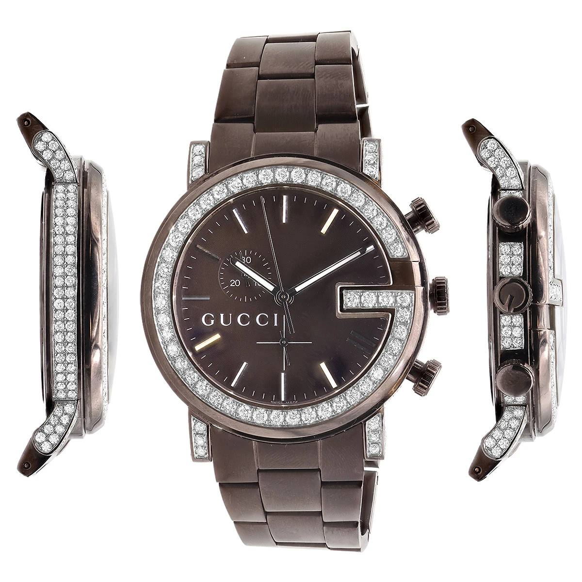 This Genuine Men’s Gucci Chrono Diamond Watch is paved in 5.5 carats of genuine diamonds, each masterfully set around the bezel, on the sides and the lugs of the brown PVD tone stainless steel case. The brown face of the watch features two chronograph subdials. Fine Swiss-made quartz movement with chronoscope function, day and date. Water-resistant 30m (100 ft).