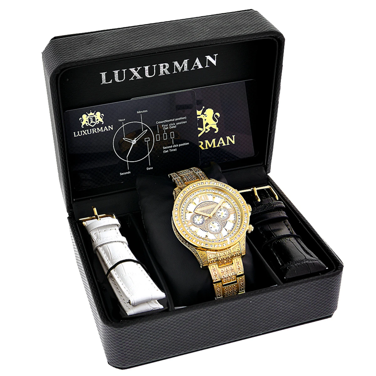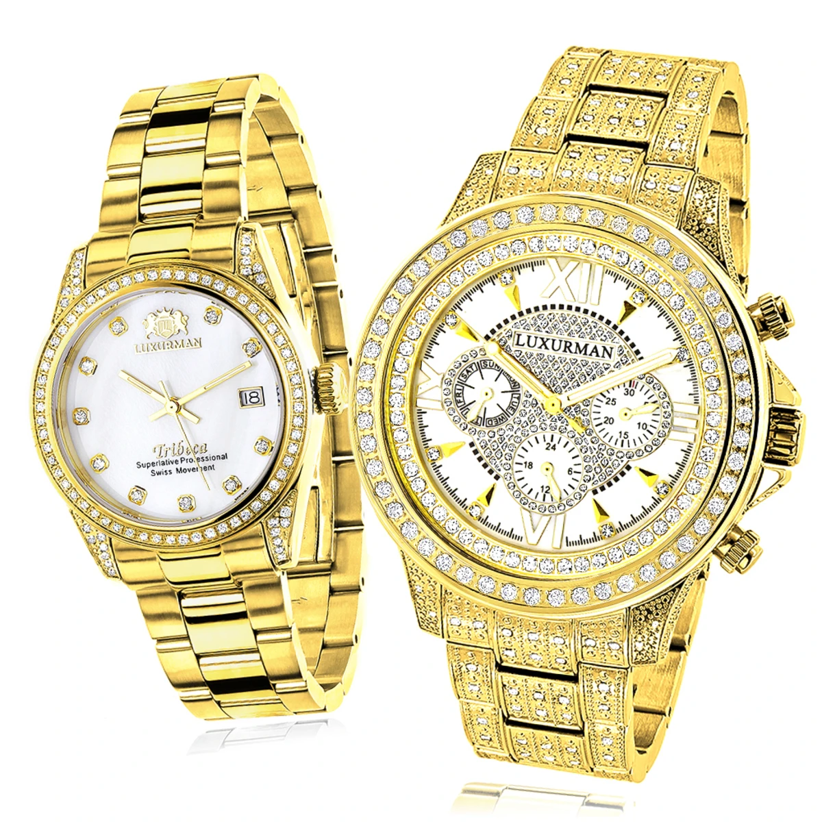 His And Hers Yellow Gold Plated Luxurman Diamond Watch 4.5ct