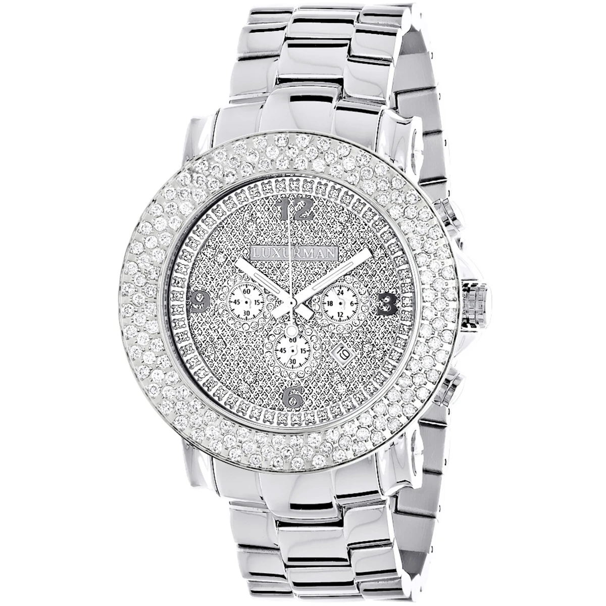 Iced Out Watches: This Large Diamond Bezel Watch for Men by Luxurman Escalade features an oversized stainless steel case, iced out face and 6.25 carats of round diamonds. The face of this LUXURMAN men’s diamond watch showcases three chronograph subdials with date and second-hand. This large diamond watch for men by Luxurman is a dazzling accessory and makes a luxurious addition to your watch collection, comes in a full retail packaging with two extra leather bands (black and white).