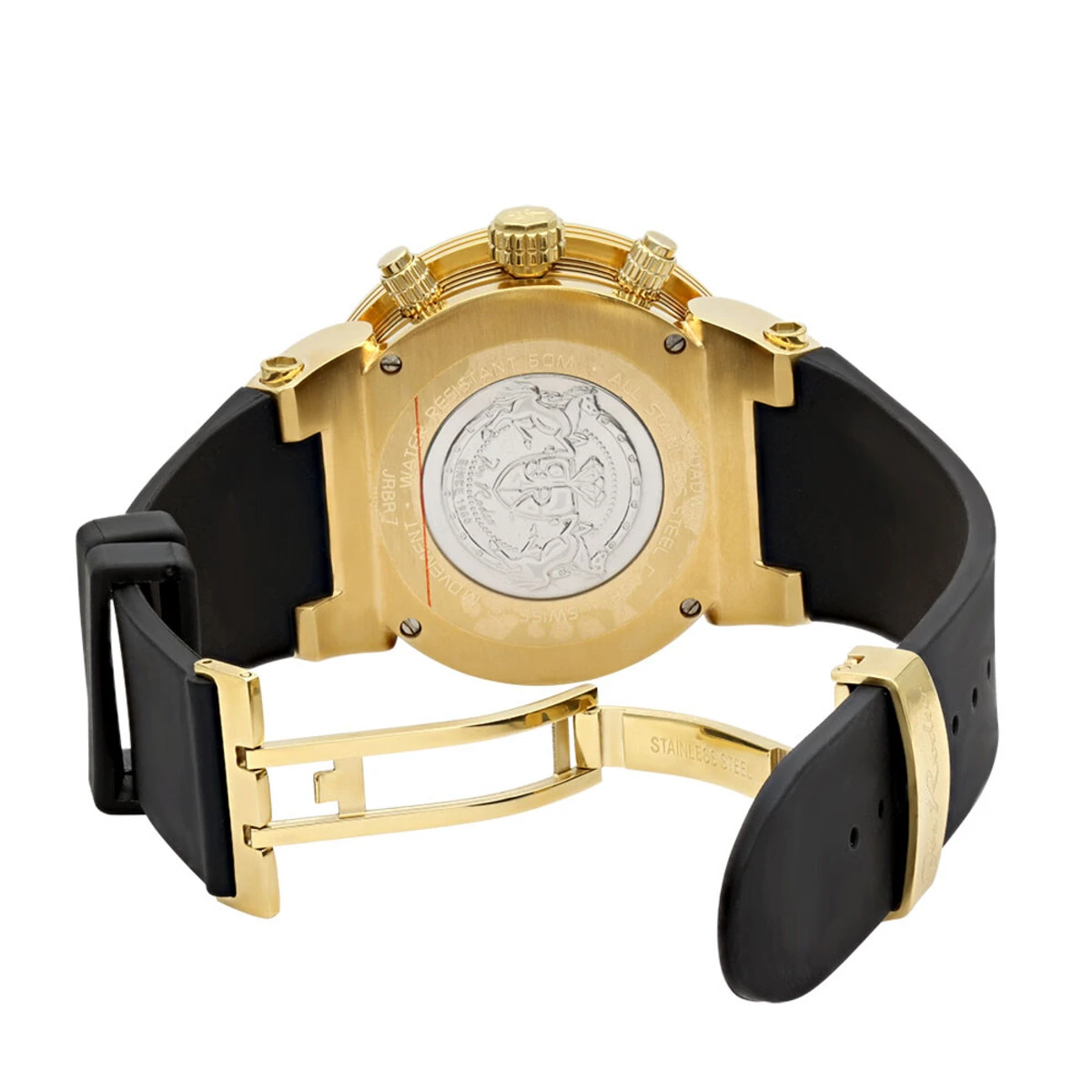 Luxurious Joe Rodeo Watches: This Broadway Men’s Diamond Watch features a very unique design, yellow gold plated stainless steel case which is paved in 5 carats of sparkling diamonds on the bezel and lugs. This Joe Rodeo diamond watch showcases iced out dial with three yellow gold tone chronograph subdials, a date display window at the 4 o’clock position, three-dimensional hour markers and a black rubber watch band. This Joe Rodeo Broadway diamond watch comes with two interchangeable rubber bands in different colors. The patented strap adjusts once for a perfect fit, and comes on and off with the press of a button. Watch is brand new, comes in retail box with full manufacturer’s warranty.