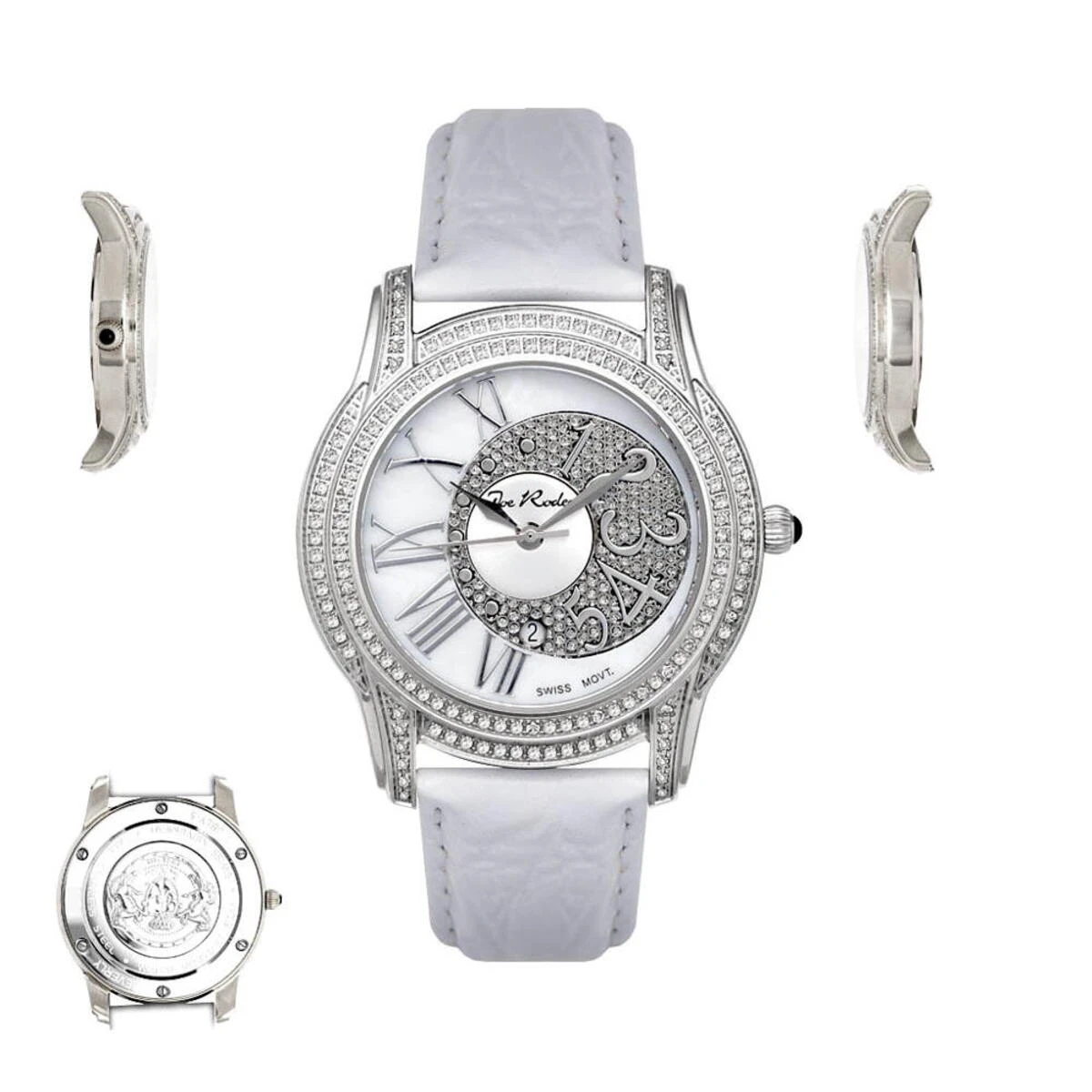 This Joe Rodeo Beverly ladies diamond watch features 1.35 carats of sparkling round diamonds, a polished round water resistant silver stainless steel case and white mother of pearl dial paved in white stones with both Arabic and roman numerals on it. This watch has white round cut diamonds around the bezel and on the lugs. Fine Swiss-made quartz movement will accurately keep time for you. This woman’s diamond watch by Joe Rodeo comes with two extra interchangeable straps.