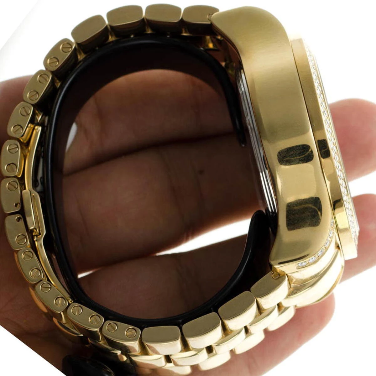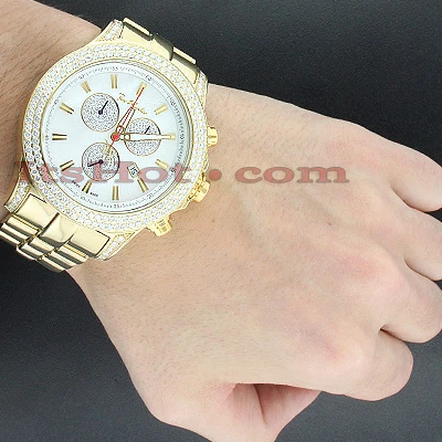 Luxurious Joe Rodeo Diamond Watches! This Master Pilot Men’s Watch features 7.00 carats of sparkling white diamonds on the bezel, lugs of the yellow gold tone stainless steel case and the yellow gold tone stainless steel band. This exquisite Joe Rodeo diamond watch showcases a white mother of pearl dial with three chronograph subdials paved in sparkling white diamonds and a date display window at the 4 o’clock position, all protected by a scratch-free crystal glass. This luxurious men’s diamond watch by Joe Rodeo is equipped with a super accurate Swiss-made chronograph quartz movement. The case is water-resistant to 100m (330 ft).