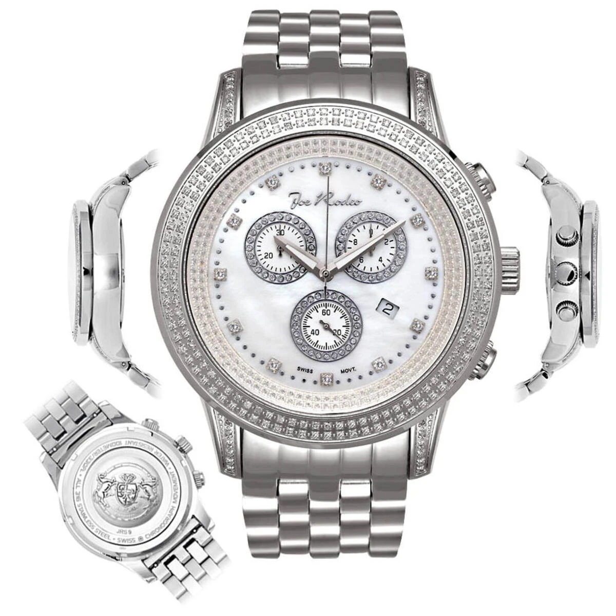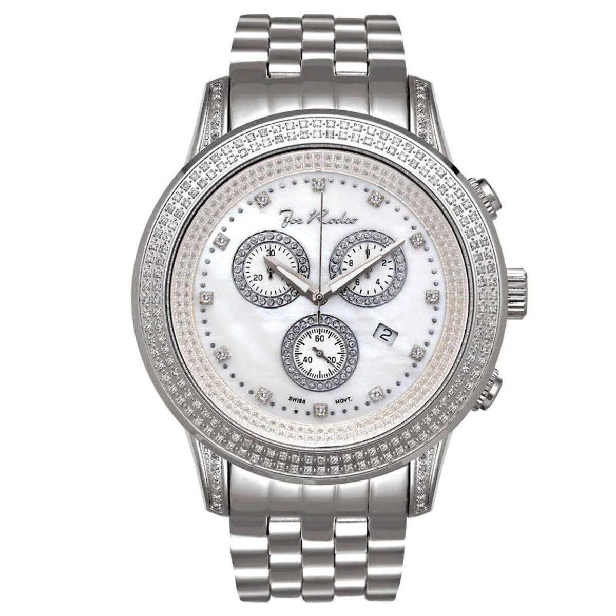 Unique Joe Rodeo Diamond Watches: This Sicily Model by Joe Rodeo showcases 1.80 carats of genuine diamonds on the bezel and lugs of its silver tone stainless steel case. This Joe Rodeo Sicily men’s diamond watch features a white mother of pearl face paved in white stones with three chronograph subdials and a date display at 4 o’clock. This fantastic men’s diamond watch houses a Swiss-made chronograph quartz movement, and is conveniently water-resistant up to 100 m (330 ft).
