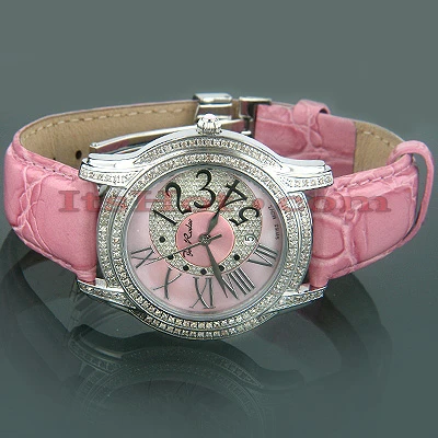 This Joe Rodeo diamond women’s watch features 1.35 carats of sparkling round diamonds, a polished round water resistant silver stainless steel case and a pink mother of pearl dial paved in white stones with both Arabic and roman numerals on it. This Joe Rodeo diamond watch has white round cut diamonds around the bezel and on the lugs. Fine Swiss-made quartz movement will accurately keep time for you. This woman’s diamond watch comes with two extra interchangeable straps.