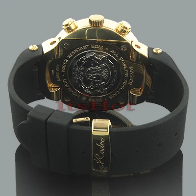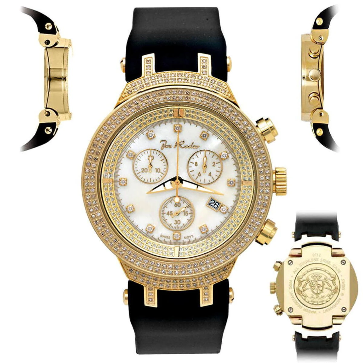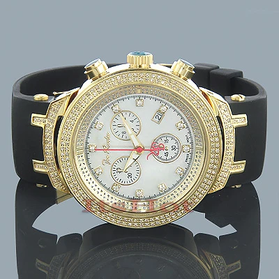Unique Joe Rodeo Diamond Watches! This JoJo Master Watch features a white dial, 2.20 carats of genuine diamonds on a polished yellow gold tone stainless steel case and lugs, a scratch-free crystal glass, an individually numbered and engraved stainless steel case-back, a black rubber band, and a fine Swiss-made quartz movement. This watch is water-resistant to 100 m (300 ft). This luxurious men’s diamond watch by Joe Rodeo comes with two interchangeable rubber bands in different colors. The patented strap adjusts once for a perfect fit, and comes on and off with the press of a button.