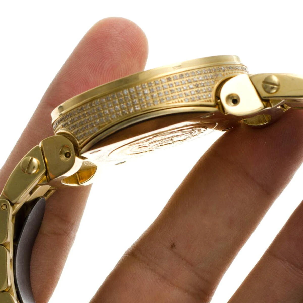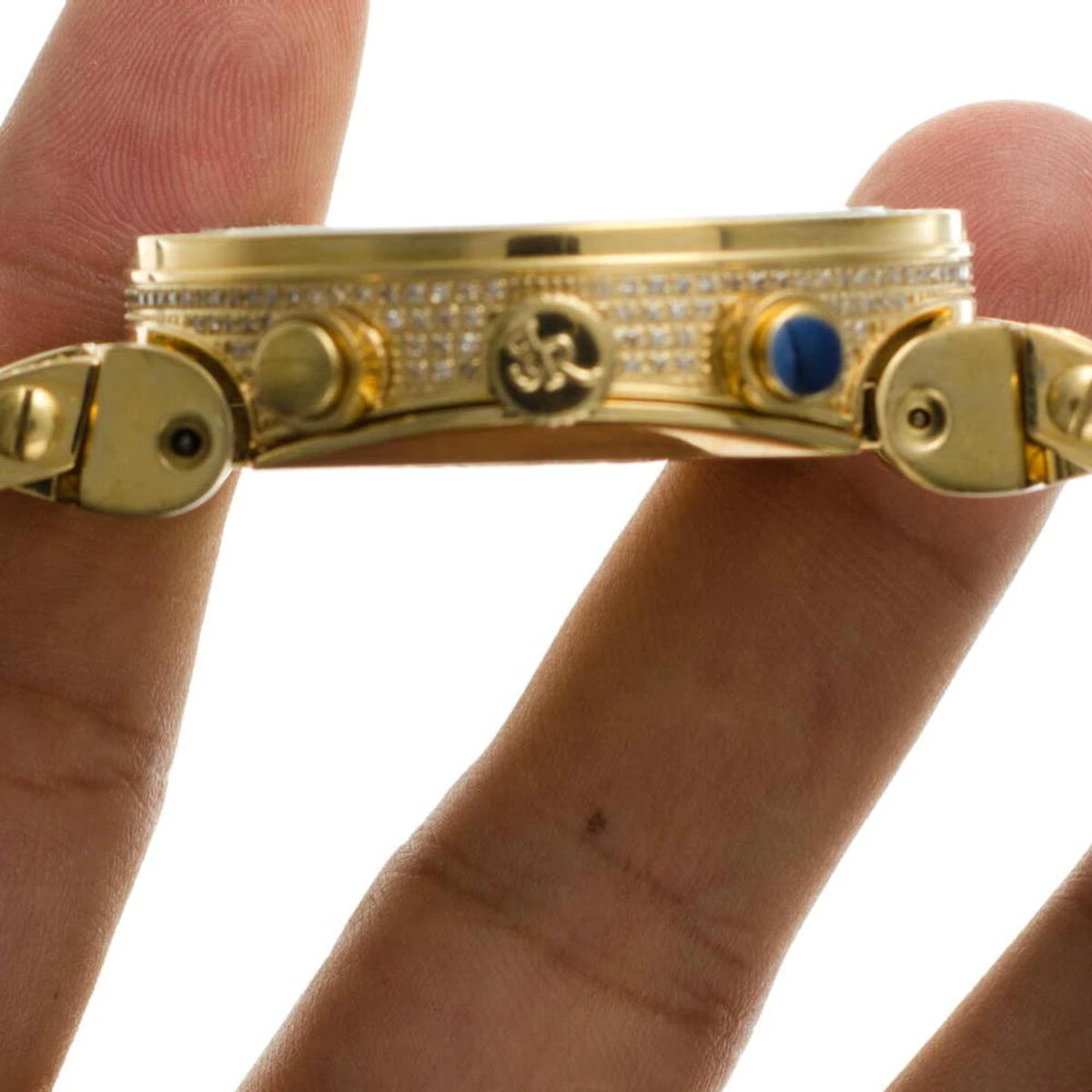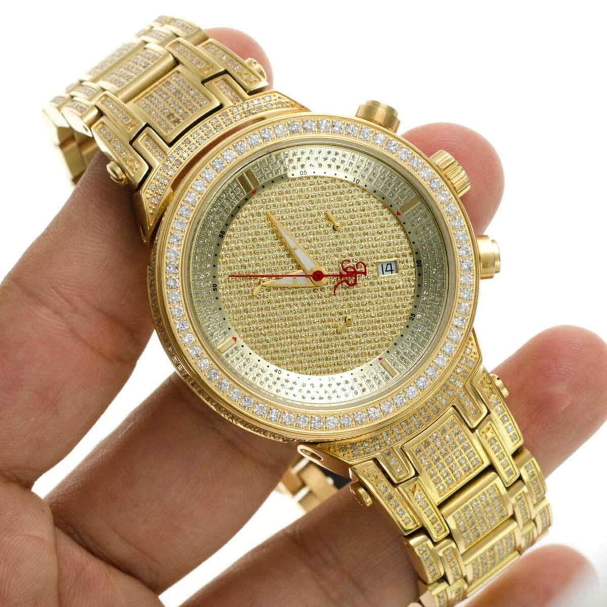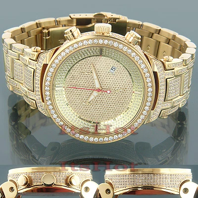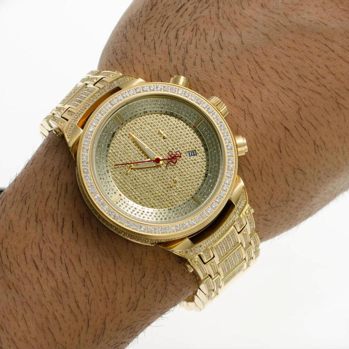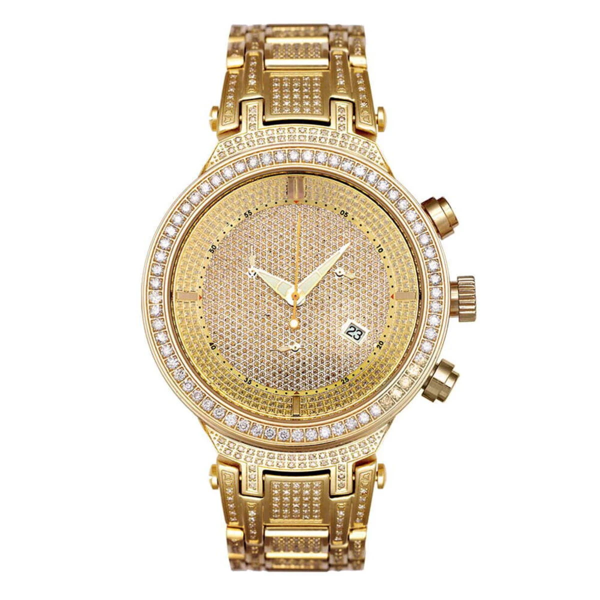 This men’s Joe Rodeo JoJo Master Diamond Watch features 7.35 carats of authentic diamonds on the bezel, lugs all around the polished yellow gold stainless steel case. The stainless steel band has three diamond links on each side. This iced out watch from Joe Rodeo watches collection is equipped with a fine Swiss-made quartz chronograph movement with date indicator. This men’s diamond watch comes with two interchangeable rubber bands in different colors. The patented strap adjusts once for a perfect fit, and comes on and off with the press of a button.
