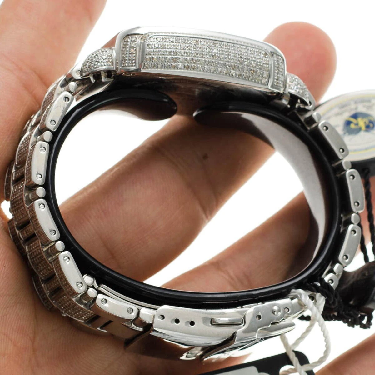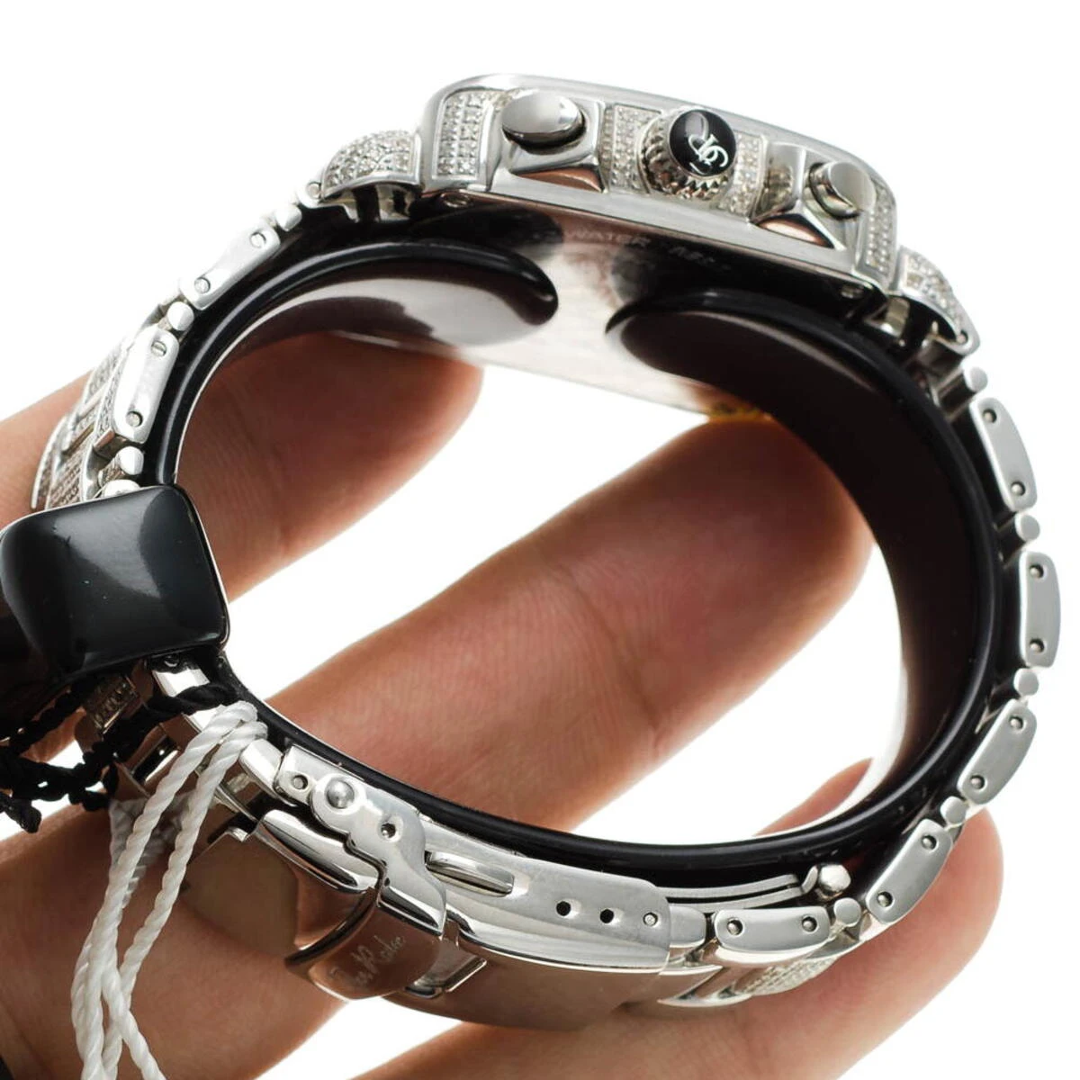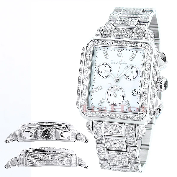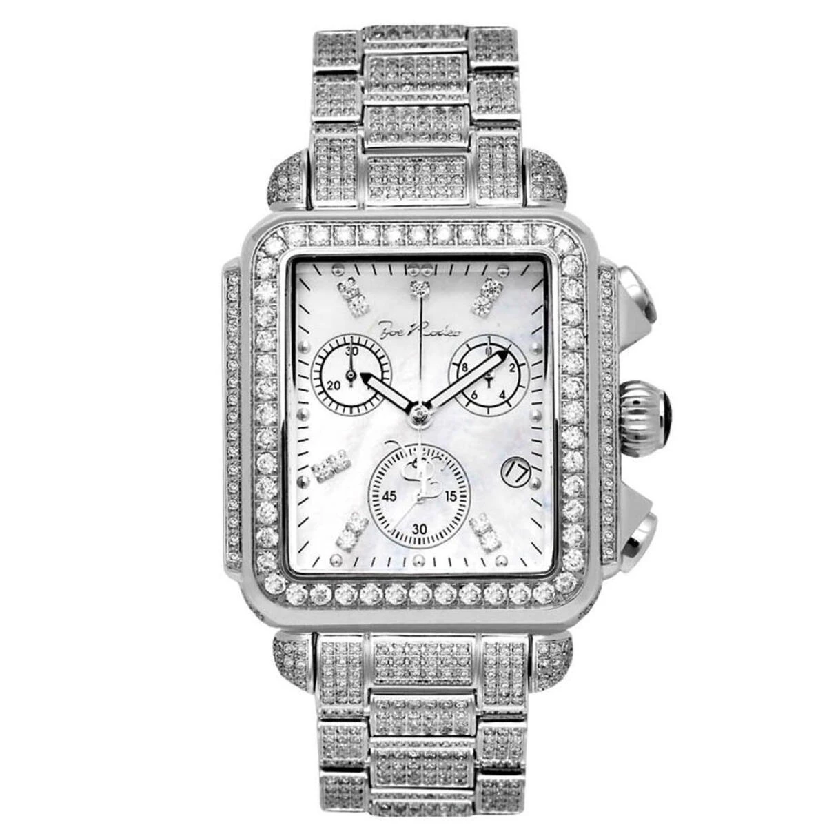 Fabulous Joe Rodeo Watches! This Swiss-Made Joe Rodeo Madison Diamond Watch is paved in 10.25 carats of genuine diamonds, each masterfully set around the bezel, on the sides of the silver tone stainless steel case, lugs and the band. The white mother of pearl face features three chronograph subdials and a date display at 4 o’clock. This luxurious Joe Rodeo diamond watch is conveniently water resistant and comes with 2 extra watch bands in different colors.