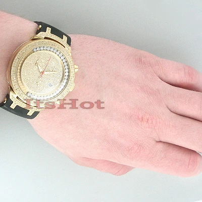 Unique Joe Rodeo Watches! This Men’s JoJo Master Diamond Watch by Joe Rodeo features 2.20 carats of round diamonds masterfully set on the bezel and lugs. A row of white sparkling stones floats around the dial. The yellow gold tone stainless steel case houses a fine Swiss-made quartz chronograph movement with a date indicator. This Joe Rodeo diamond watch comes with two interchangeable rubber watch straps in different colors. The patented strap adjusts once for a perfect fit, and comes on and off with the press of a button.