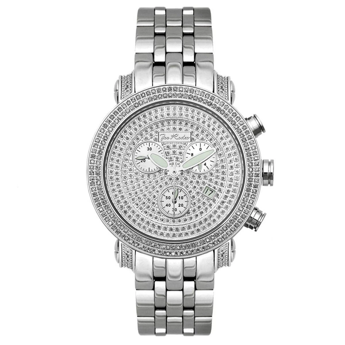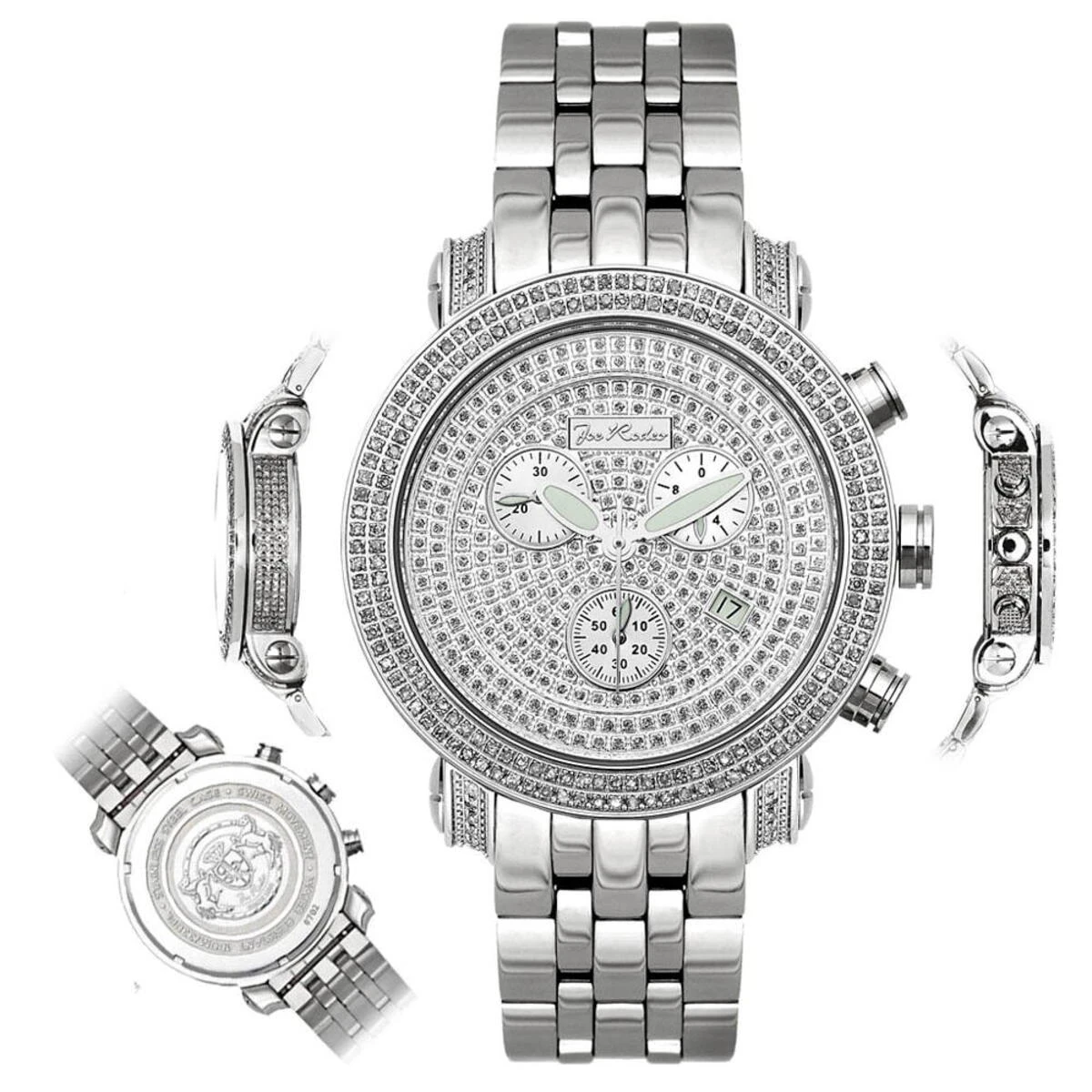 This 3.50-carat JOJO diamond bezel Joe Rodeo watch showcases a round polished stainless steel case, scratch-free crystal glass, individually numbered and engraved stainless steel case-back. Fine Swiss-made quartz movement with chronograph function, center second and date. Water-resistant to 100 meters. Comes with two interchangeable straps in different colors. The patented strap adjusts once for a perfect fit, and comes on and off with the press of a button.