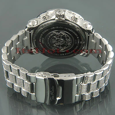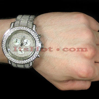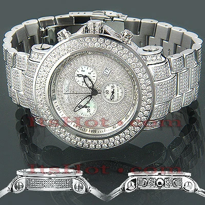 This men’s JoJo Joe Rodeo Junior diamond watch features 19.75 carats of genuine diamonds, a polished silver stainless steel case with diamonds on the sides, lugs and on the bezel, stainless steel band paved in white diamonds. A scratch-free crystal glass roofs silver stainless steel dial paved in white diamonds. 10 ATM water-resistant case houses a fine Swiss-made quartz movement with chronograph function, center second and date. This Joe Rodeo diamond watch comes with two interchangeable leather straps in different colors. The patented strap adjusts once for a perfect fit, and comes on and off with the press of a button.