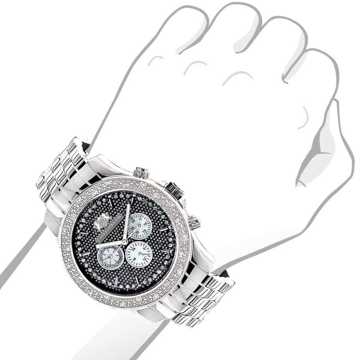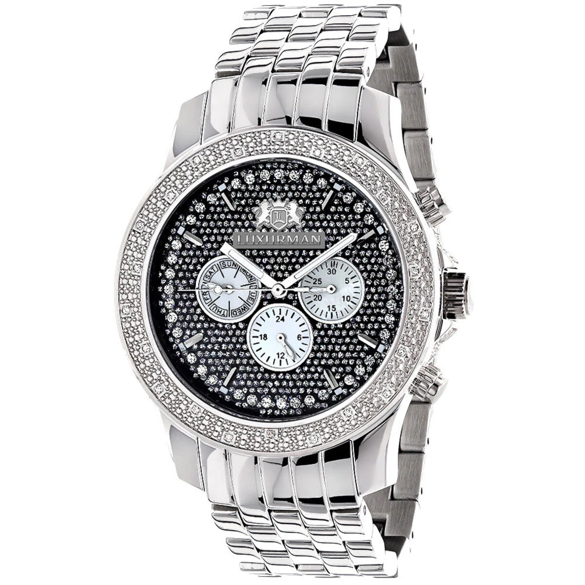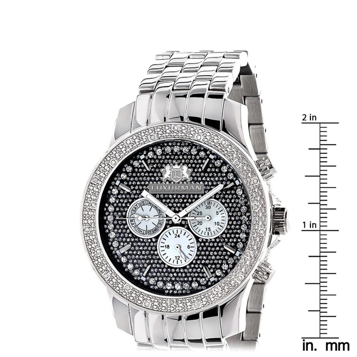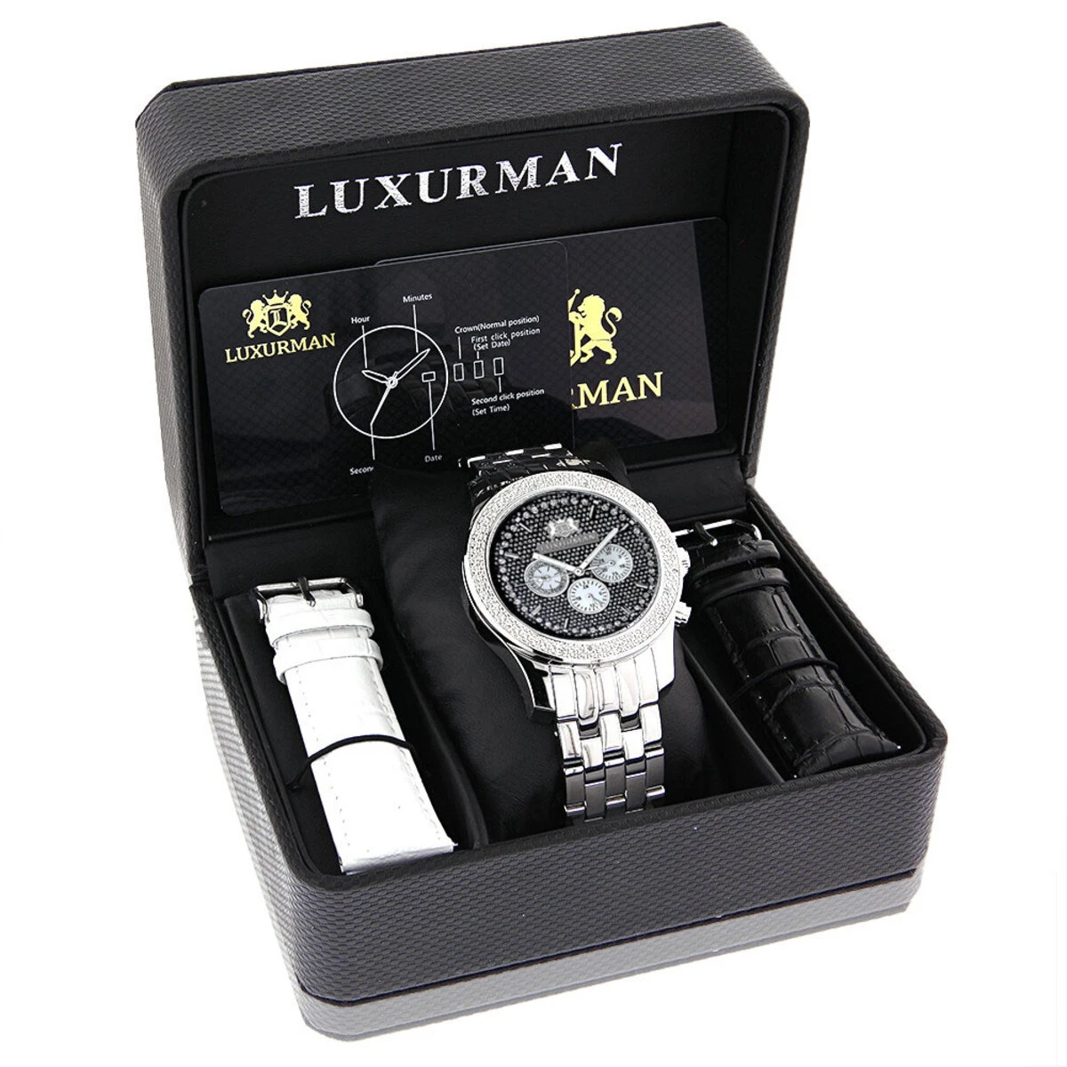 From our men’s diamond watches collection this affordable real diamond watch for men by Luxurman is an oversized Raptor model featuring oversized 46mm case, iced out dark dial, 0.25 carats of genuine diamonds and stainless steel band. This luxurious Luxurman diamond watch houses a fine Japan-made quartz movement and is conveniently water-resistant to 30 m (110 ft). Brand new watch with full 5 year factory warranty, retail packaging and two extra leather bands in different colors.