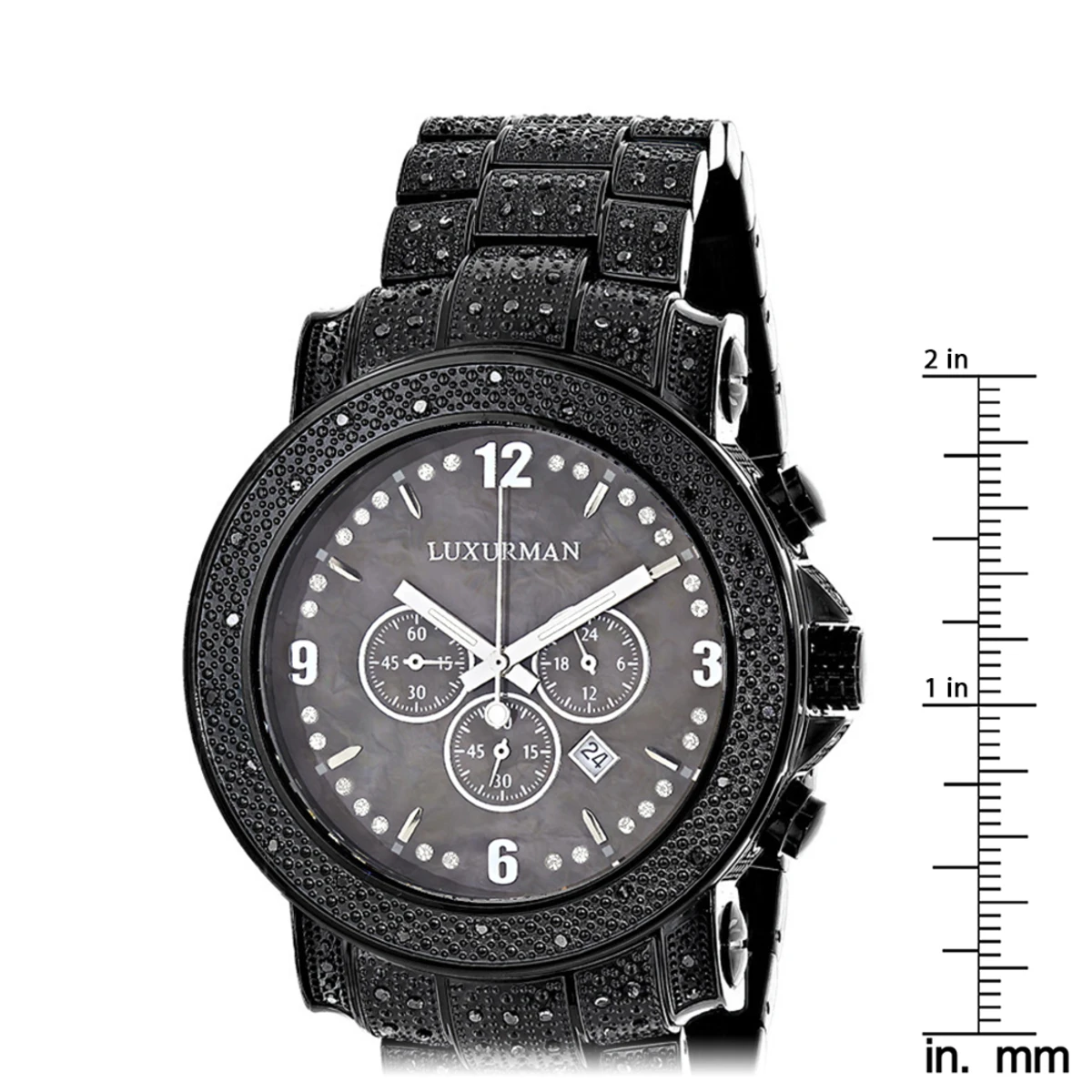 This Luxurman Black Diamond Watch for Men – Fully Iced Out – is an oversized watch and features 2 carats of black diamonds, a black stainless steel case, a polished black stainless steel band paved with black diamonds, and a black MOP dial. This Luxurman men’s diamond watch makes a unique gift for a special occasion and comes with two extra interchangeable leather straps in different colors.