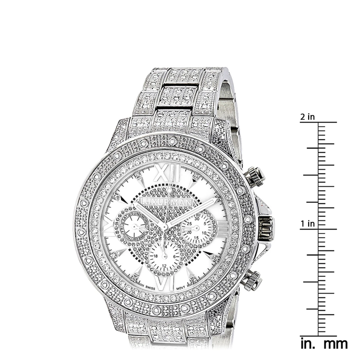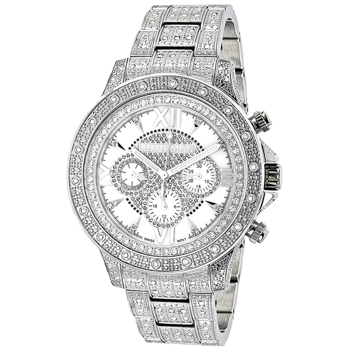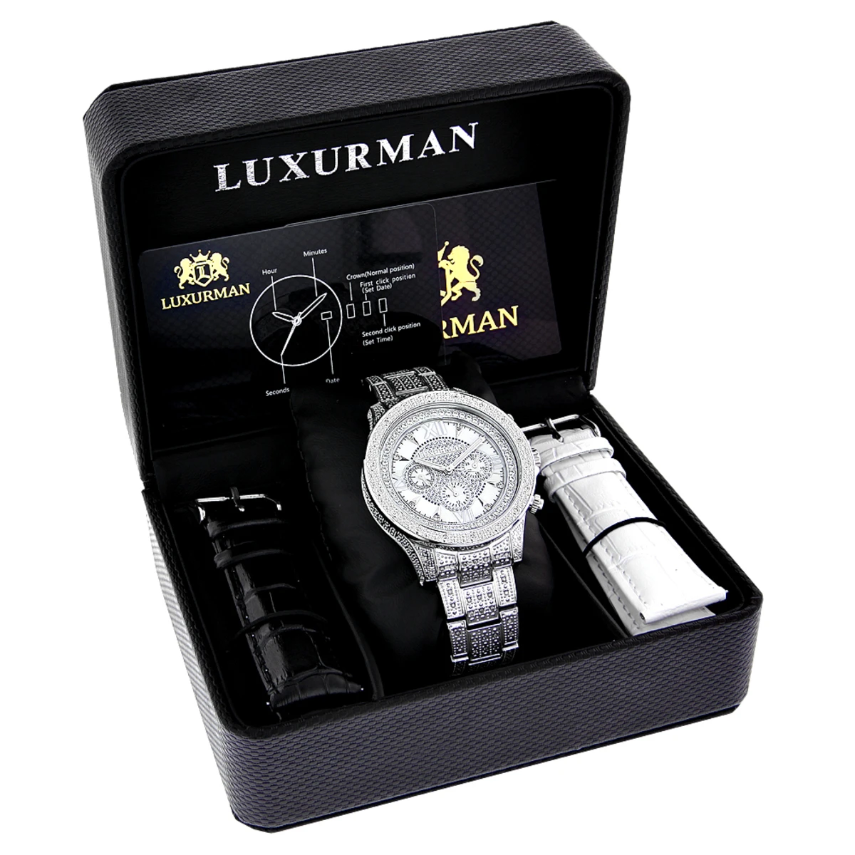 Designer Luxurman Watches: This Iced Out Men’s Diamond Watch fully paved with 1.25 carats of genuine diamonds. Features a white mother of pearl face with three subdials, a white gold plated stainless steel case and band paved with genuine diamonds. This luxurious men’s diamond watch by Luxurman comes with two extra interchangeable straps in different colors (band colors may vary).