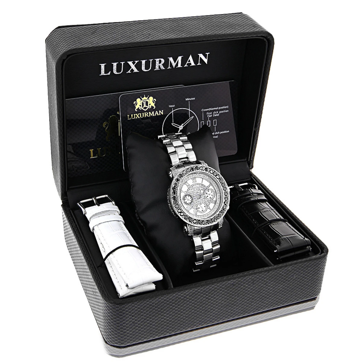 Designer Luxurman Watches! This Ladies Black Diamond Watch by Luxurman showcases 2.50 carats of fancy black diamonds on the bezel. This Luxurman diamond watch features a white face paved in white sparkling stones and three subdials, a silver tone stainless steel case and a polished silver tone stainless band. This Ladies diamond wrist watch houses a fine Japan-made quartz movement, and is conveniently water-resistant.