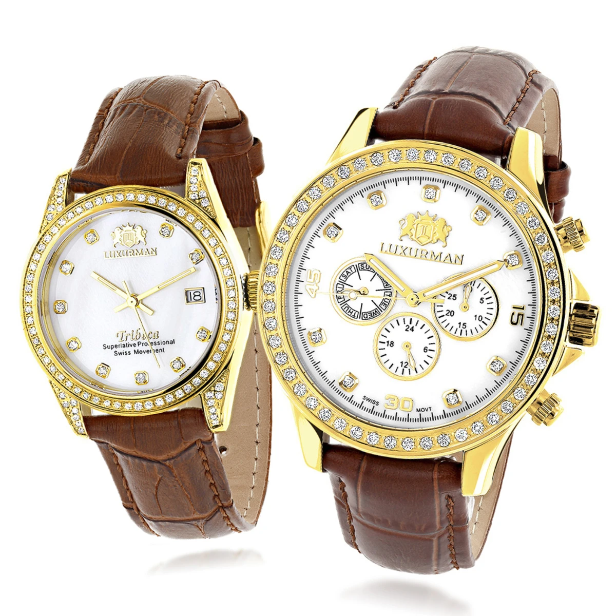 These Matching His and Hers Watches Luxurman Yellow Gold Plated Diamond Watches are plated in 18K Yellow Gold featuring white mother of pearl face, a yellow gold plated stainless steel case and brown genuine leather band. Both women’s and men’s diamond watch are conveniently water-resistant to 3 ATM and come with a 5 year manufacturer’s warranty. The Diamond Watch for Her features 1.5 carats of genuine diamonds, a Swiss movement and a date display window at 3 o’clock position while the Diamond Watch for Him showcases 2 carats of genuine diamonds, Date/Calendar/24 hours and also a Swiss movement. Both watches come in retail boxes with paperwork and full manufacturer’s warranty. Buy this wonderful watch set today!