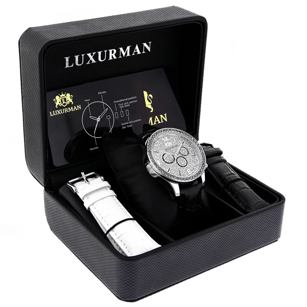 Luxurious Luxurman Watches! This Men’s Black Diamond Watch showcases 3 carats of genuine diamonds on the bezel, a face paved in white sparkling stones with three subdials, a silver stainless steel case and a black genuine leather band. This men’s diamond wrist watch by LUXURMAN houses a fine Swiss-made quartz movement, and is conveniently water-resistant. This men’s diamond watch is also available with metal band shown in the video.
