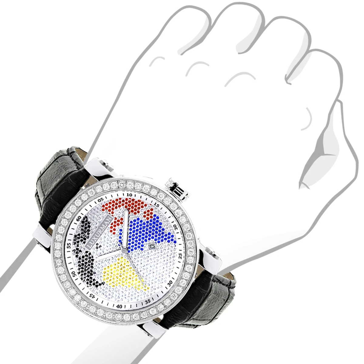 This Luxurman men’s diamond watch features 4 carats of VS quality white sparkling diamonds, polished silver stainless steel case with a soft genuine black leather band and a continents dial paved in multicolor stones dial with a date display. Water-resistant to 30 m (110 ft).