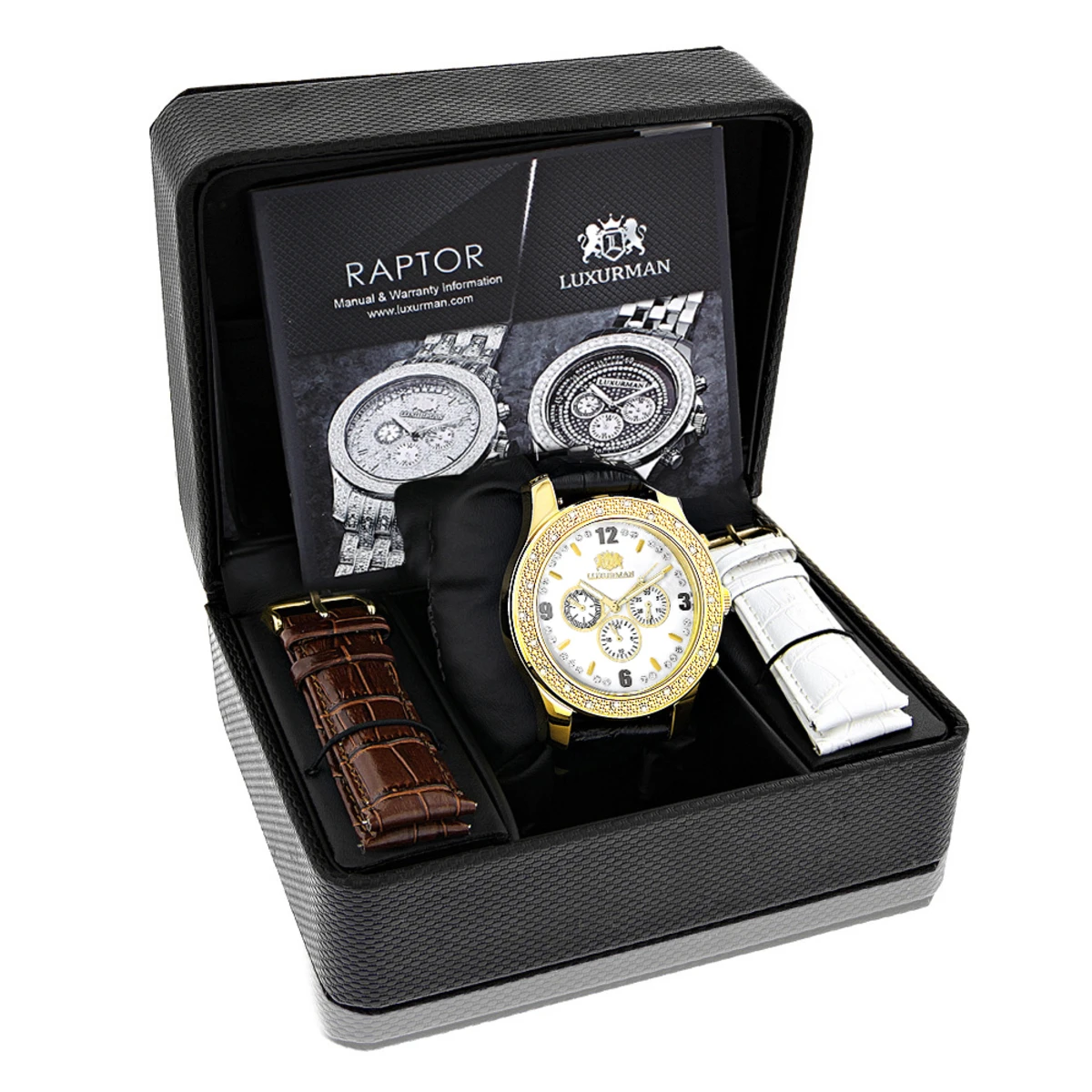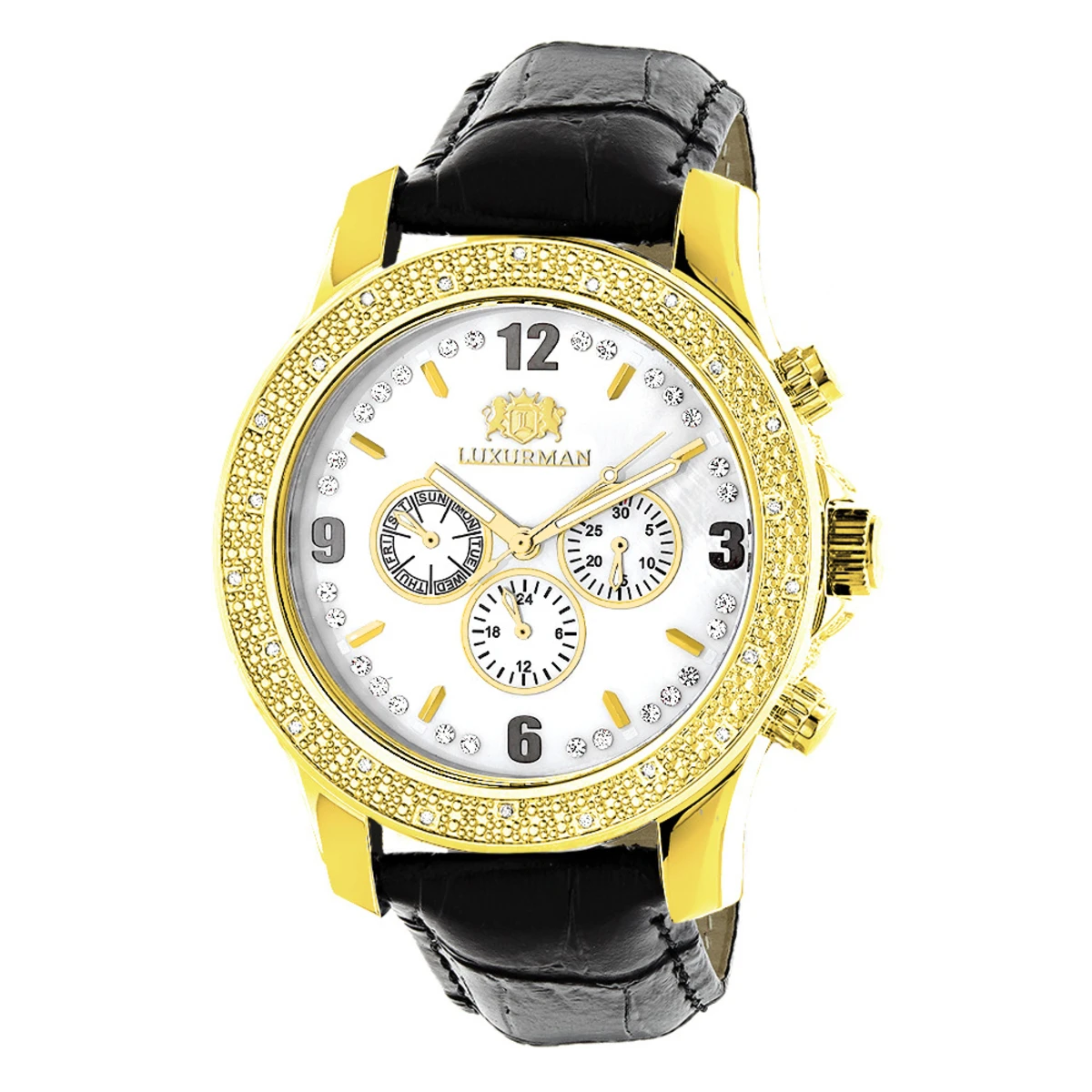 Exclusive Luxurman Watches! This Men’s Diamond Watch by Luxurman features 0.25 carats of genuine diamonds, a polished yellow gold stainless steel case with a black genuine leather strap and a white mother of pearl face with three chronograph subdials. This Luxurman diamond watch showcases a fine Japan-made quartz movement and is conveniently water-resistant to 30 m (110 ft).