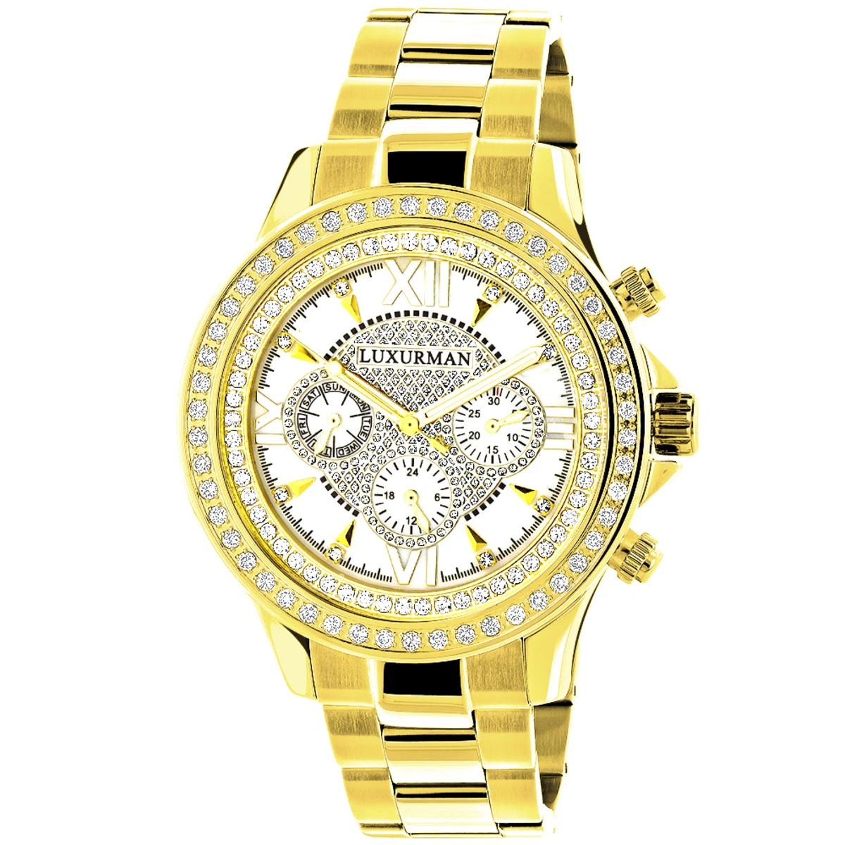Men’s Diamond Bezel Watch Yellow Gold Plated Luxurman 2ct