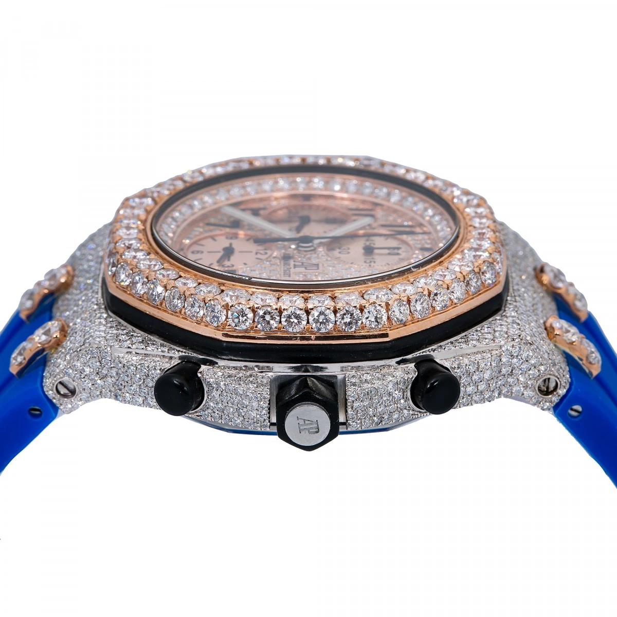 The Audemars Piguet Royal Oak Offshore Rose Gold W01258 is a stunning men’s diamond watch that is sure to turn heads. This luxurious timepiece features a 42mm rose gold case with a bezel set with 17.25 carats of white diamonds. The bezel is crafted from 18k rose gold and is sure to make a statement. The blue rubber bracelet is comfortable and stylish, and the sapphire crystal dial is adorned with rose gold tone and diamonds. The automatic movement ensures accurate timekeeping, and the watch is water resistant up to 100 meters.This watch is perfect for any special occasion or for everyday wear. The diamonds sparkle and shine, and the rose gold case and bezel make this watch stand out from the crowd. The engravable case back makes this watch a perfect gift for someone special.With its stunning diamonds, rose gold case and bezel, and blue rubber bracelet, this watch is sure to be a conversation starter. The sapphire crystal dial is adorned with rose gold tone and diamonds, and the automatic movement ensures accurate timekeeping.