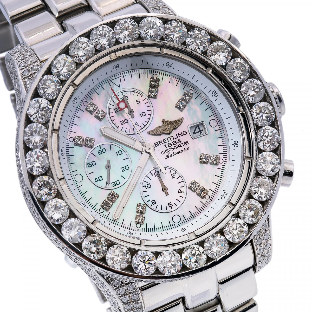 Introducing the Breitling Super Avenger 42mm Men’s Diamond Watch. This luxurious timepiece is crafted with a stainless steel bezel that is adorned with 16.5 carats of white diamonds. The dial is made of mother of pearl and features a sapphire crystal for added durability. The stainless steel bracelet is comfortable and stylish, making this watch perfect for any occasion.The Super Avenger is powered by an automatic movement and is water resistant up to 100 meters. This watch is also engravable, making it a great gift for a special someone. The Breitling Super Avenger is a timeless piece that will last for years to come.This watch is perfect for the man who appreciates quality and style. With its luxurious design and superior craftsmanship, the Breitling Super Avenger is sure to make a statement. Whether you’re looking for a timeless timepiece or a special gift, the Breitling Super Avenger is the perfect choice.