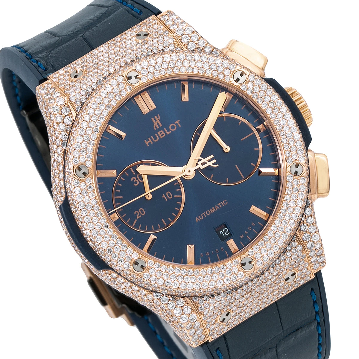 Introducing the Hublot Classic Fusion Rose Gold 45mm Blue Dial Men’s Diamond Watch. This exquisite timepiece is crafted from 18K rose gold and features a bezel set with 12.75 carats of white diamonds. The blue dial is adorned with rose gold-tone hands and markers, and is protected by a scratch-resistant sapphire crystal. The watch is powered by an automatic movement and is water-resistant up to 5 ATM. The watch is completed with a black leather bracelet and a secure deployment clasp.This stunning watch is perfect for any special occasion. The rose gold case and bezel, combined with the blue dial and white diamond accents, make this watch a timeless classic. The automatic movement ensures accuracy and reliability, while the water-resistance up to 5 ATM makes it suitable for everyday wear. The black leather bracelet is comfortable and stylish, and the deployment clasp ensures a secure fit.The Hublot Classic Fusion Rose Gold 45mm Blue Dial Men’s Diamond Watch is a luxurious timepiece that will never go out of style. With its timeless design and superior craftsmanship, this watch is sure to become a treasured heirloom. Whether you’re looking for a special gift or a timeless piece to add to your own collection, this watch is sure to impress.