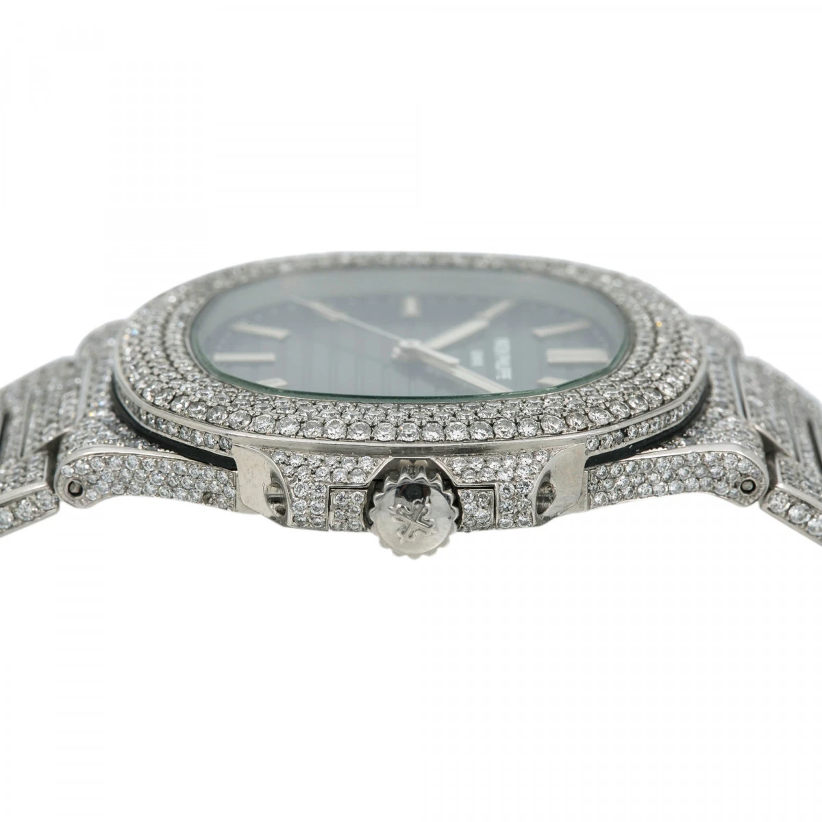 The Patek Philippe Nautilus 40mm Blue Dial Men’s Diamond Watch is a luxurious timepiece that is sure to make a statement. Crafted with a stainless steel case and bezel, this watch is adorned with white diamonds for a touch of sparkle. The blue dial is accented with white hands and markers, making it easy to read the time. The stainless steel bracelet is also set with white diamonds, adding to the overall elegance of the watch. Powered by an automatic movement, this watch is water resistant up to 10 ATM and comes with a 5-year warranty.This watch is perfect for the man who appreciates luxury and style. The diamonds add a touch of sophistication to any look, while the stainless steel case and bracelet provide a sleek and modern look. The blue dial is a classic color that will never go out of style, making this watch a timeless piece that can be worn for years to come. Whether you’re dressing up for a special occasion or just want to add a touch of luxury to your everyday look, the Patek Philippe Nautilus 40mm Blue Dial Men’s Diamond Watch is the perfect choice.
