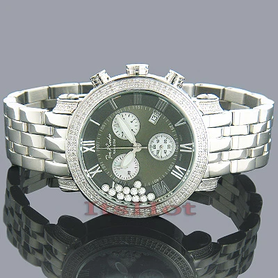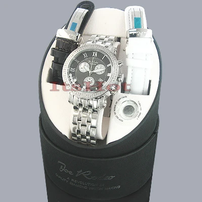 This 1.75-carat rainbow JOJO watch with a diamond bezel showcases a round polished Silver stainless steel case and band, scratch-free crystal glass, black face with white subdials and individually numbered and engraved stainless steel case-back. Fine Japan-made quartz movement with chronograph function, center second and date. Water-resistant to 100 meters. Comes with two interchangeable straps in different colors. The patented strap adjusts once for a perfect fit, and comes on and off with the press of a button. One full year manufacturer’s warranty.