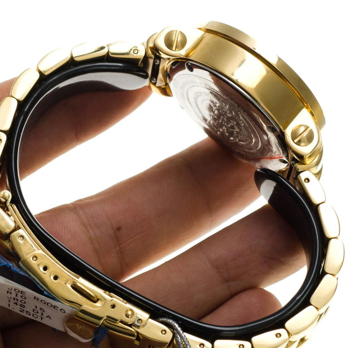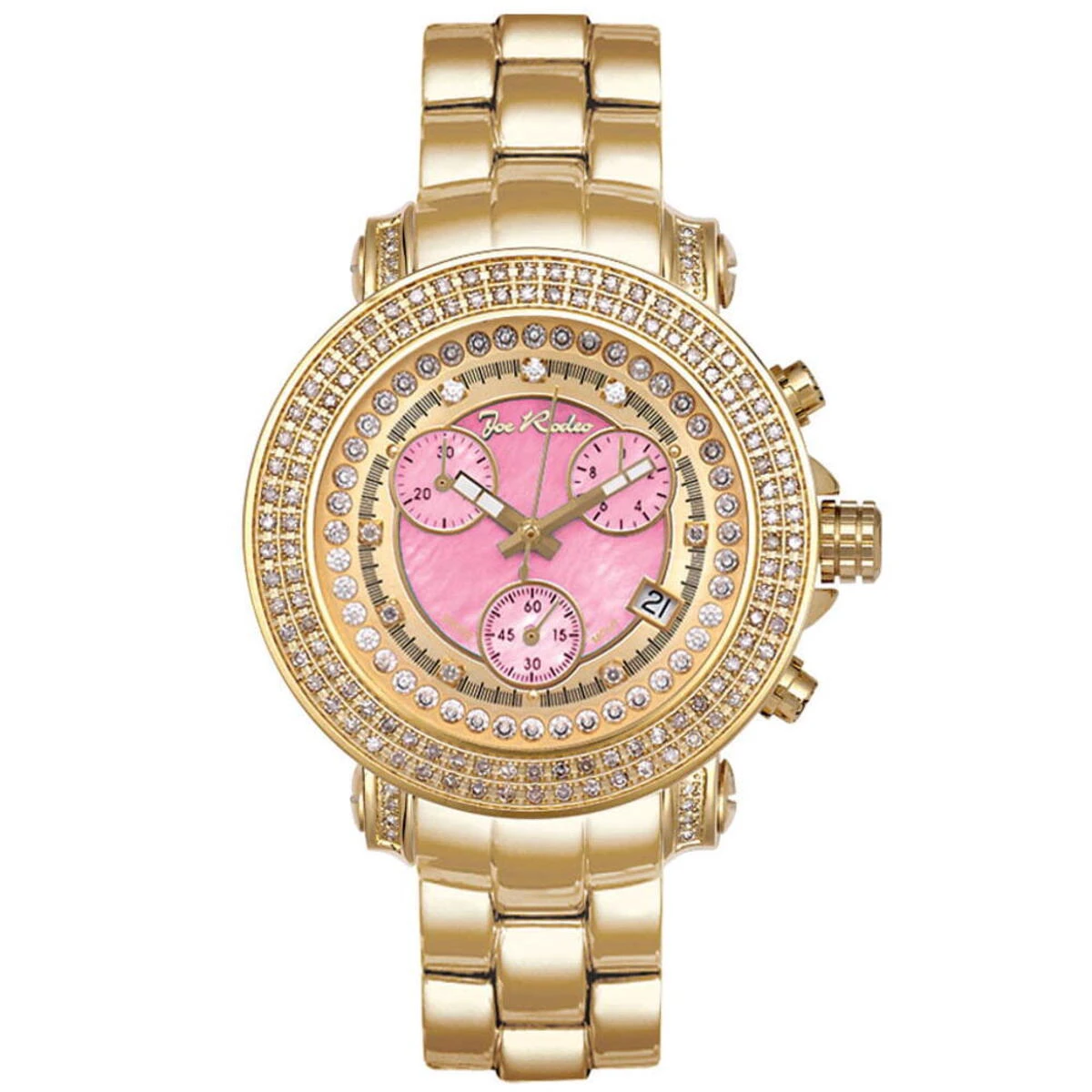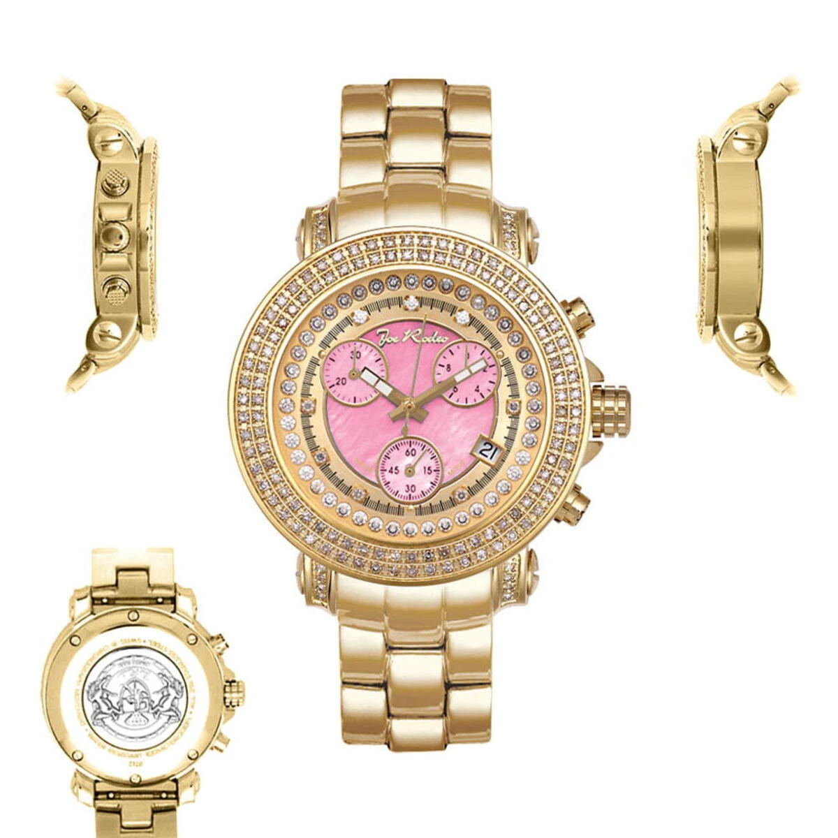 This Joe Rodeo women’s diamond JoJo watch features sparkling round diamonds on the bezel and lugs totaling 1.25 carats that are set on a Yellow Gold highly polished Stainless Steel case. This women’s diamond watch features a yellow gold tone stainless steel dial with pink Mother of Pearl centerpiece and subdials. This JoJo watch by Joe Rodeo is water-resistant to 100 meters (330 ft). A Swiss made quartz movement will accurately keep time for you. This iced out watches collection item comes with two interchangeable straps in different colors. The patented strap adjusts once for a perfect fit, and comes on and off with the press of a button.
