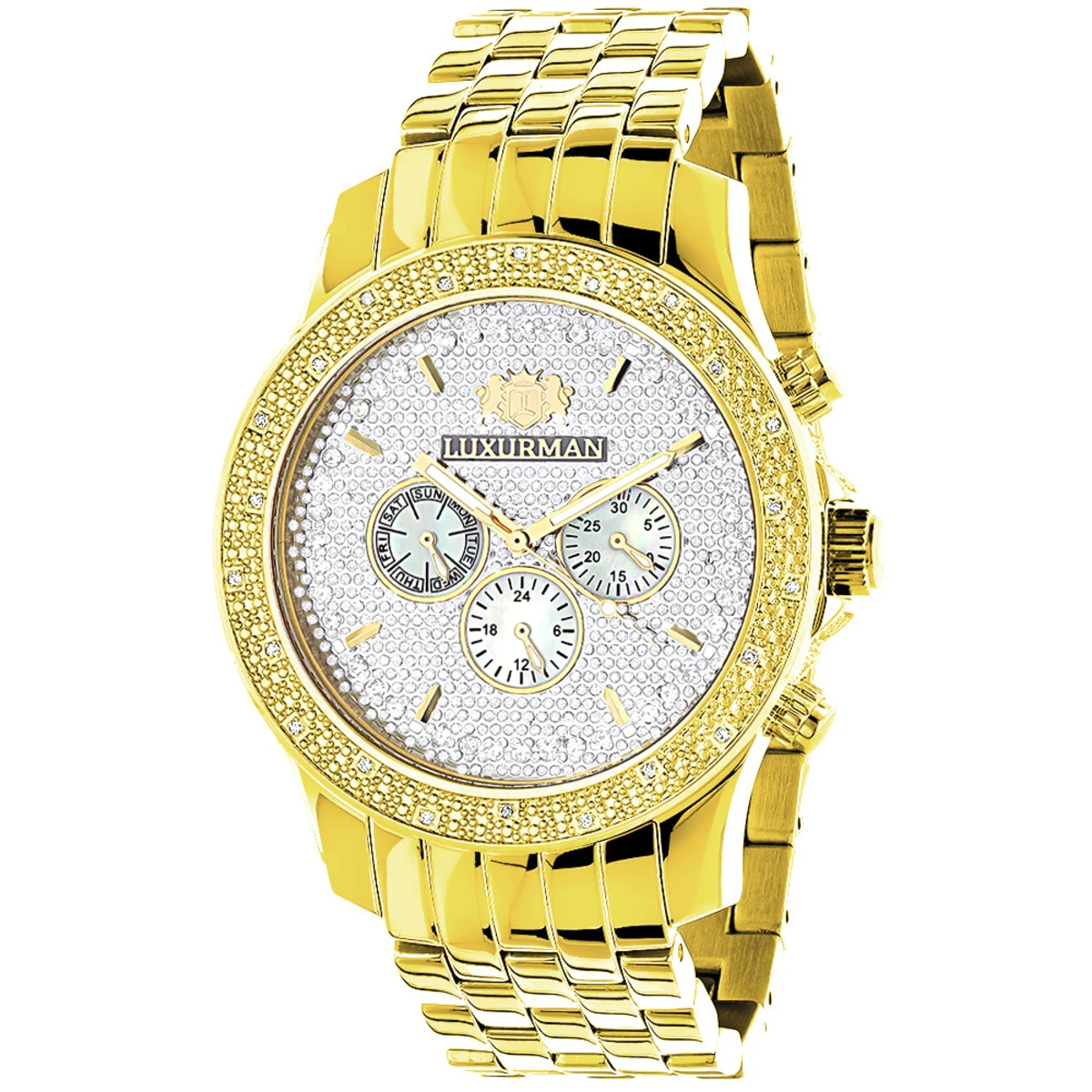 Luxurious Yellow Gold Tone Watches: This Luxurman Men’s Diamond Watch features 0.25 carats of genuine diamonds, a polished yellow gold tone stainless steel case, a stainless steel band and a face paved in white sparkling stones with three subdials. This Luxurman diamond watch showcases a fine Japan-made quartz movement and is water-resistant.